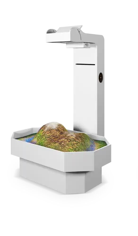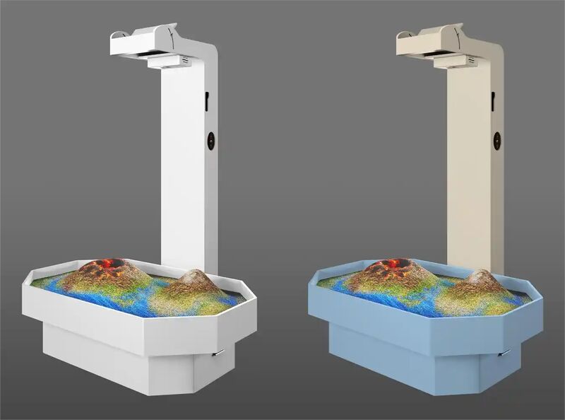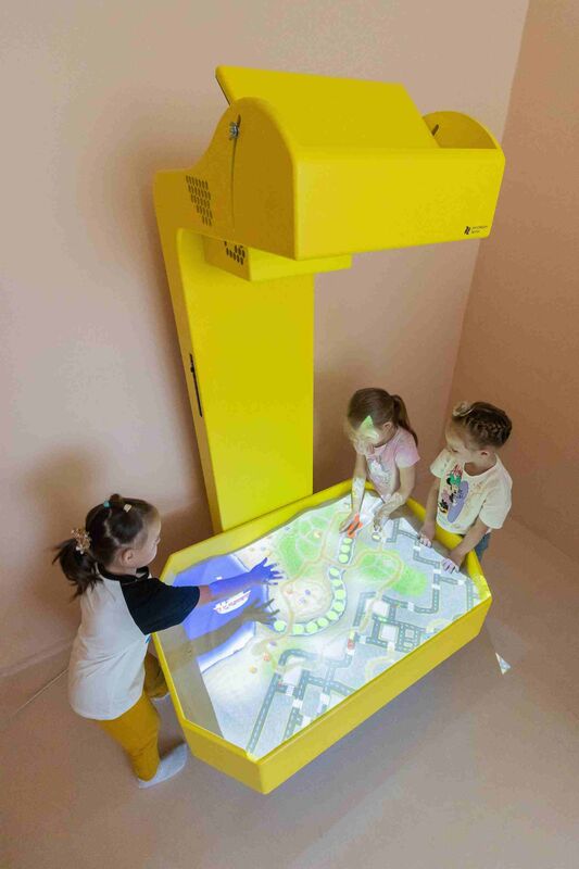С помощью проектора и датчика движения песок превращается в интерактивную поверхность: дети могут моделировать рельеф, создавать горы, моря и вулканы, наблюдая за их «оживлением» в реальном времени. Дополнительные панели позволяют использовать оборудование как интерактивный стол с обучающими программами по развитию речи и изучению окружающего мира.