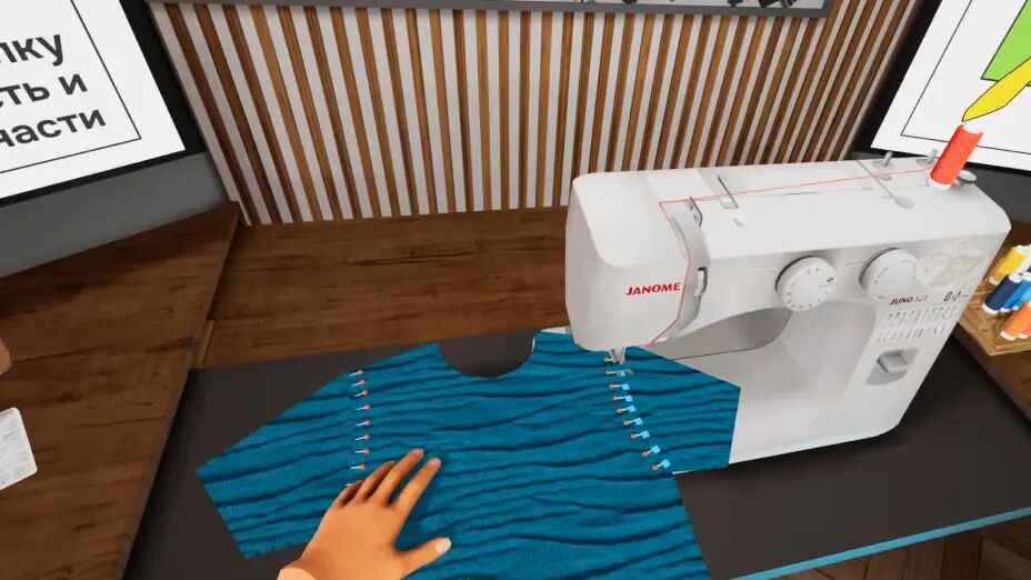 После надевания VR-гарнитуры пользователь оказывается в виртуальной швейной студии, оснащённой необходимыми инструментами и оборудованием. Обучение проходит поэтапно: