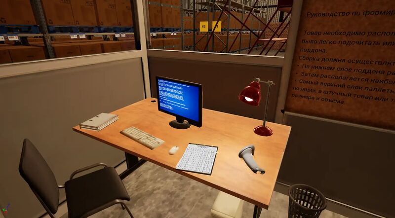 - Максимальная реалистичность. Детально воссоздана структура промышленного склада: стеллажи с буквенно-цифровой навигацией, зона приёмки и зона сборки, работа со штрих-кодами и накладными.