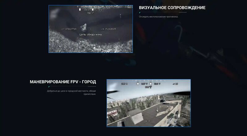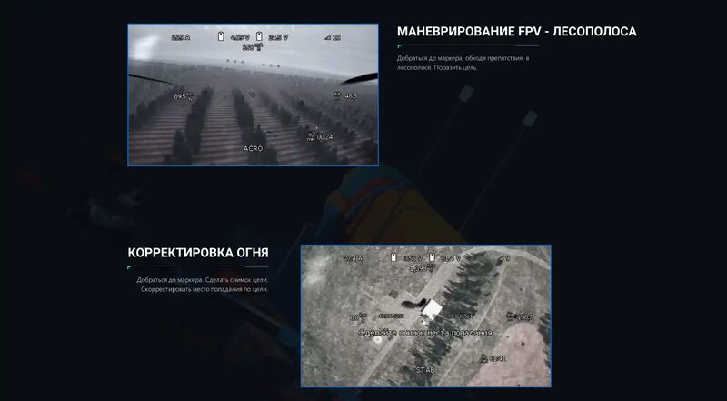 - «Маневрирование FPV — Лесополоса» — обходите препятствия в лесополосе, доберитесь до маркера и поразите цель.