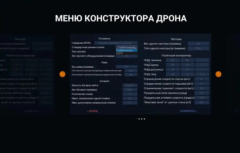 - Гибкие настройки. Конструктор дрона позволяет настраивать и сохранять параметры БПЛА под конкретные задачи.